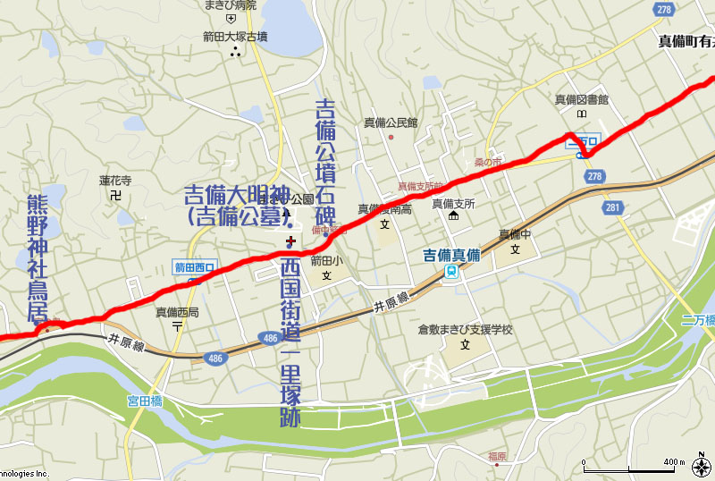 さて、街道を先に進むと、小高い丘があります。 ここに吉備大明神(吉備真備公)のお墓があり、神社に祀られています。 吉備真備はこの辺りの出身でした。 吉備真備は西暦695年生まれで、遣唐使にも留学生として同行した後、聖武天皇や孝謙天皇に仕えて右大臣まで出世しました。 |