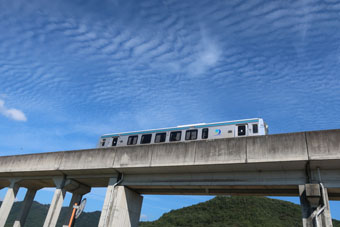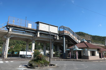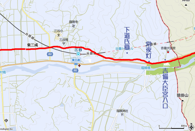 山の中腹に灯籠が見えます。 これは下道氏の墓でして、江戸時代中期元禄12年(1699)に銅製骨蔵器が発見され吉備真備の父である下道圀勝、弟圀依が母の骨を納めたと刻まれており下道氏の墓所と判明したとの事です。 間もなく三谷駅の高架下をくぐります。 井原線は国鉄末期に計画された路線だけあって、やたら高規格に作られています。 |