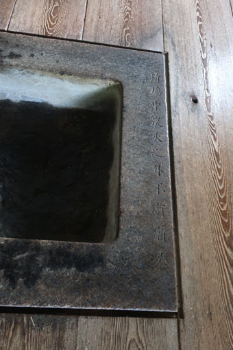 ![]() 飲室(休憩室)にあるいろり 炭火以外の使用を禁止すると刻まれています。 |