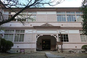 資料館を見学した後、岡山市内の宿に向かいます。 | ![]() 閑谷中学(高校)時代の校舎 資料館となっています。 |