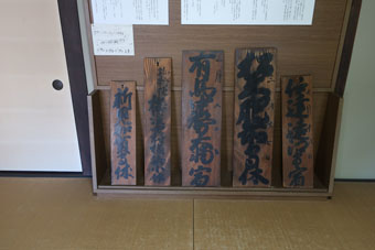 本陣では利用のつど、玄関に看板を出して知らせていました。 看板の一部が展示されていました。 |
