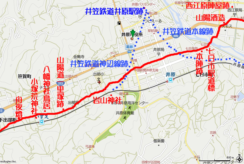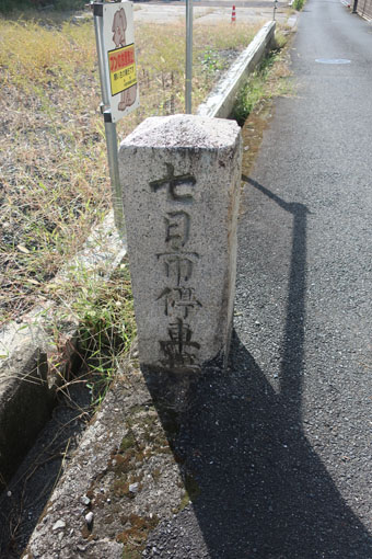 橋を渡ると旧七日市市街に入ります。 七日市は西国街道の宿場町として江戸時代から栄えていました。 井原鉄道に先立ち、井笠鉄道が大正2年に笠岡〜井原間を開業し、七日市にも駅が置かれました。 その時の駅への道標を発見しました。 井笠鉄道本線は、国鉄が井原線を建設することになったため、競合を避けて昭和46年に廃業しています。 |