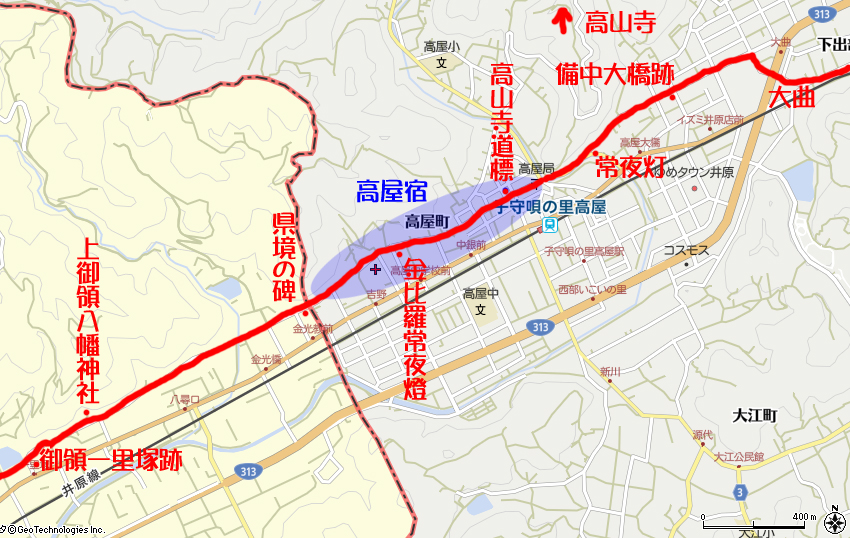 高山寺道標の東側に、高屋宿の本陣があったようです。 ちなみに最寄り駅が子守歌の里高屋駅である由来は、井原市出身の声楽家である上野耐久が、恩師の山田耕筰に母親が歌っていた子守歌を聴かせ、それを山田耕筰が編曲して「中国地方の子守歌」として発表したことにちなんでいるようです。 |