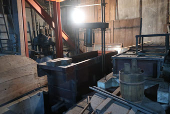 お店の方のご厚意で、蔵の中を見学させていただきました。 醪を搾る機械や、宴会で使用されていたであろう漆塗りの膳や器があり、かつての賑わいを感じさせてくれました。 |