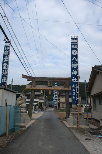 上御領八幡神社前を通過します。 祭神は応神天皇、神功皇后で、創建は不明だそうです。 祭神が祭神だし、旧山陽道に面している立地といい、奈良時代くらいからありそうな感じですよね。 |