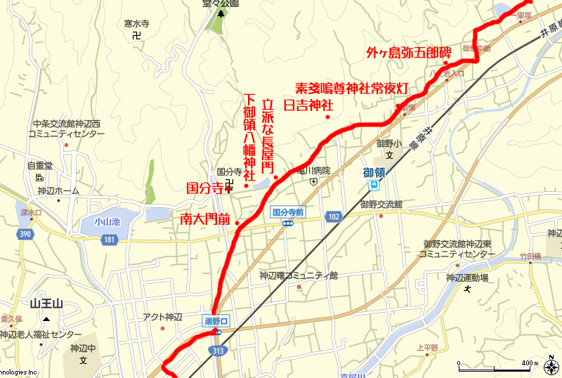 下御料八幡神社前、国分寺前を通過しました。 この先は川沿いを進み、お昼ご飯を食べるため、少しルートを外れました。 |