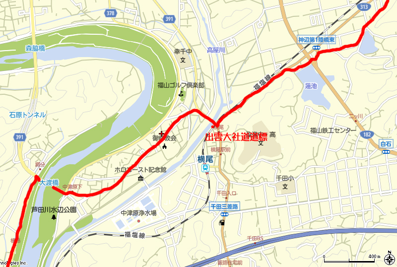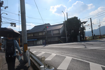 鶴が橋南詰交差点に、出雲大社道の道標がありました。 また、交差点には鞆屋商店という醤油蔵もありました。 この近くに横尾という駅があるのですが、ここを通過すると次は山陽本線の備後赤坂駅まで駅がありません。 少し考えましたが、先に進むことにしました。 |