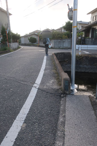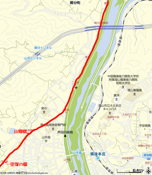 ここからは、芦田川の氾濫は河川改修で西国街道が消滅していまして、ひたすら芦田川堤防下の歩道を南下します。 山陽自動車道の高架下を通過し、ひたすら退屈な道を歩くのは、なかなか骨が折れることです。 ようやく街道は堤防を離れますが、細い道にもかかわらず抜け道になっているようで、交通量が多いので、歩いていても楽しくないです・・・ |