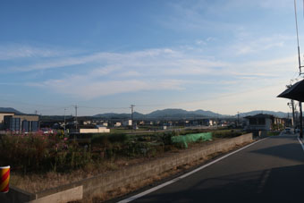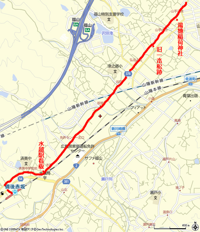 西国街道の旧蹟や、新幹線の高架を見ながら、備後赤坂駅を目指します。 | ![]() 新幹線の高架が見えます。 |