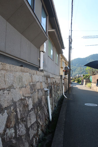 高屋川と芦田川の間を進みます。 川に挟まれた土地柄のためか、民家はかさ上げされた石垣の上に建っていました。 |