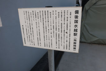 飛脚問屋の解説板があり、 宝暦2年(1752年)に備後〜江戸間に定期飛脚便が開かれたとの説明がありました。 水越郵便局(岡本家)には、その時の看板が残っているそうです。 |