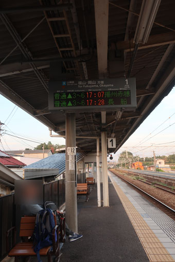 長い戦いが終わりました。 岡山に戻る電車を待ちます・・・ 岡山までは1時間かかるので、なんとか座れたらいいのですが。 |